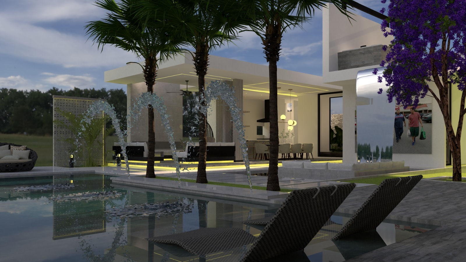 En la primera planta, la zona exterior se convierte en un oasis privado, con una piscina infinita que parece fundirse con el horizonte, rodeada de un elegante espacio de BBQ y un comedor exterior ideal para disfrutar de reuniones familiares o con amigos. La sala de estar al aire libre, rodeada de vegetación vertical, proporciona un ambiente fresco y natural. Complementando esta área, se encuentra un gimnasio completamente equipado con un baño y vestidor, así como un sauna privado, ofreciendo un refugio de bienestar y relajación. Además, un cine exterior con pantalla grande está diseñado para disfrutar de noches de cine bajo las estrellas, todo en un entorno que incluye un espejo de agua que añade un toque de elegancia.